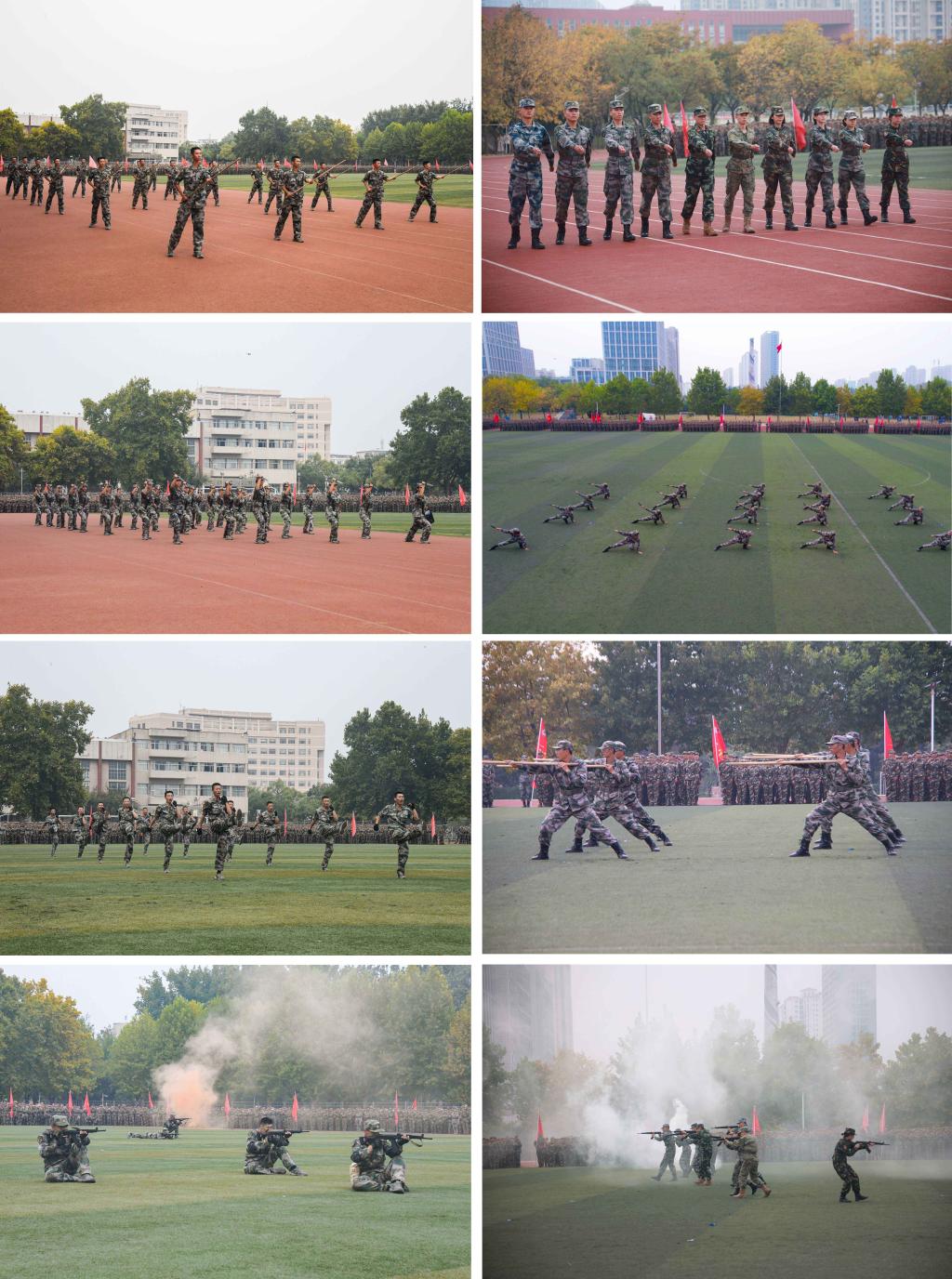 教官们慷慨激昂、振奋人心的军事演出将全场气氛点燃:军训一团男教官的应急棍术表演孔武有力、激情飞扬,展现出当代男儿的铮铮铁骨与热血担当;军训一团女教官们的捕俘刀拳法干脆利落,直击要害,展现出巾帼不让须眉的时代风范。倒地擒拿之术习得非一日之成,唯有历经肉苦皮伤方能走向成功。战场救护演习结合战术示范,应急救护更模拟真实战场环境,硝烟弥漫,枪林弹雨间,教官们既要救助伤员,又要团结攻坚。教官们身先士卒、率先为范给同学们莫大的鼓励。在接下来的汇报表演上,曲园学子们迸发出虎踞龙腾般生生不息的青春活力:一排排步伐铿锵有力,如驰原骏马,倍添生命之荣光;一声声呐喊响彻云霄,如猛虎哮谷,勃发豪迈之英姿。