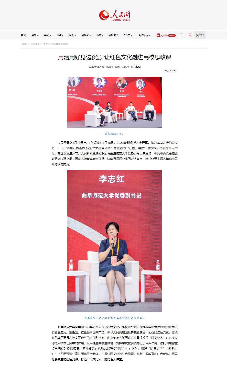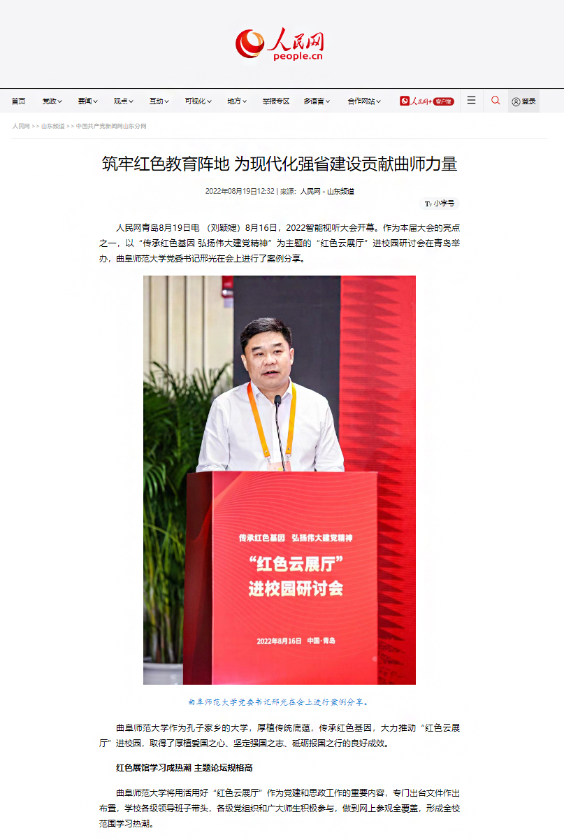 8月16日,由中央网信办、人民日报社、山东省人民政府指导,青岛市人民政府、山东省委网信办、人民网主办的2022智能视听大会开幕。作为本届大会的亮点之一,以“传承红色基因 弘扬伟大建党精神”为主题的“红色云展厅”进校园研讨会在青岛举办,人民网以《筑牢红色教育阵地 为现代化强省建设贡献曲师力量》《用活用好身边资源 让红色文化融进高校思政课》为题报道了开云手机入口厚植传统底蕴、传承红色基因、推进立德树人的红色教育开展情况。