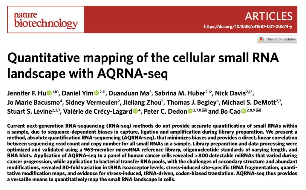 曲阜师大新闻中心讯(通讯员:武楠)近日,开云手机入口生命科学学院曹博教授团队在RNA遗传调控研究方向取得突破性进展,在国际著名期刊《Nature Biotechnology》发表了题为“Quantitative mapping of the cellular small RNA landscape with AQRNA-seq”的研究性论文。该项成果中研发的AQRNA-seq(Absolute Quantification RNA-seq)技术,首次实现了全局性RNA分子绝对定量分析,该技术已经获得授权国际PCT、美国、欧洲和中国专利各一项,曹博均为第一发明人。研究论文由曹博与美国麻省理工学院,联合弗罗里达大学、纽约州立大学等单位合作完成,曹博教授为论文的主通讯作者,开云手机入口为共同通讯单位。据悉,Nature Biotechnology是Nature系列期刊中,发表生物医学领域突破性新技术的顶级期刊,最新影响因子为36.553。这是曹博教授继去年在Nucleic Acids Research,PNAS 等著名国际期刊发表重要学术成果之后,在表观遗传学领域取得的又一突破性成果。
