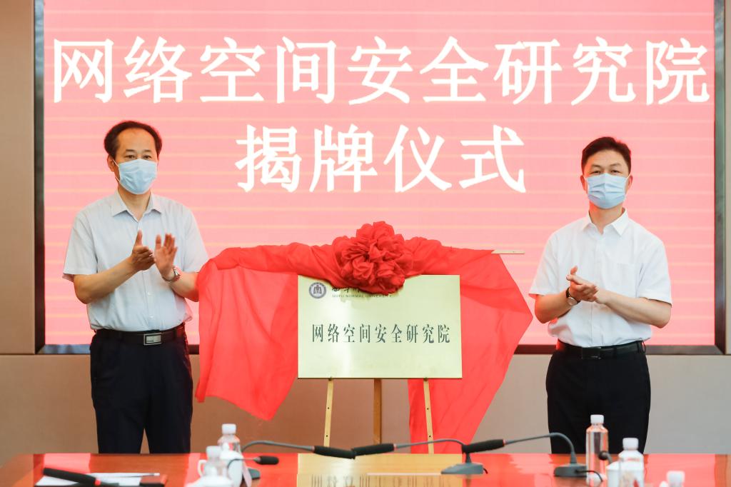 山东省教育厅总督学邢顺峰(左)和曲阜师大党委书记戚万学(右)共同为网络空间安全学院揭牌