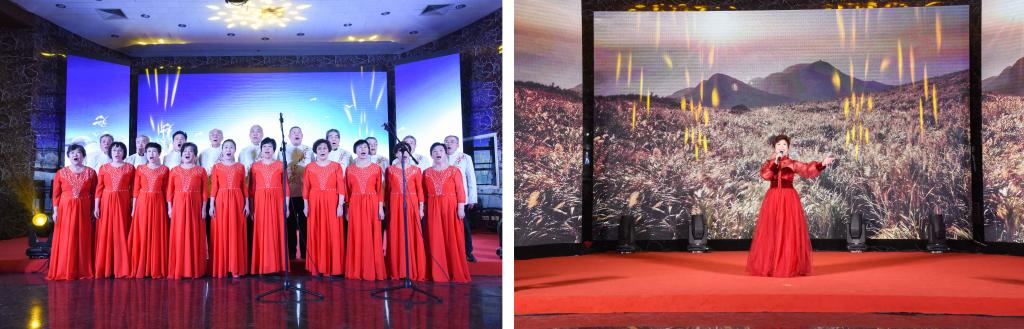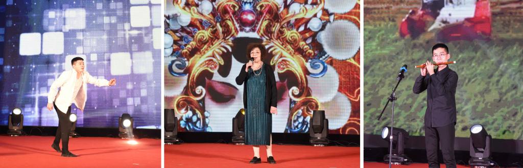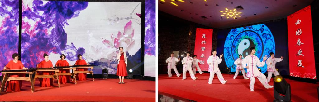 演出在大合唱《祖国吉祥》《爱我中华》中拉开帷幕,歌声饱含深情,铿锵有力,唱出了对伟大祖国的无限热爱与祝福之情;女声独唱《故乡是北京》京腔京味十足,赢得了现场阵阵掌声;现代独舞《海阔天空》以丰富的舞蹈语言展现了不畏艰难的韧劲与奋勇拼搏的斗志;京剧选段《贵妃醉酒》婉转动听的腔调,优美动人的身段,把国粹京剧的魅力展现得淋漓尽致;伴随着悠扬的古琴声,抑扬顿挫的朗诵《新年,你好!》传递了浓浓的新春气息和对大家的问候;竹笛独奏《扬鞭催马运粮忙》欢快婉转,喜气洋洋,表达了丰收的喜悦心情;太极拳表演一招一式刚柔并济、如行云流水,展现了传统武术的魅力;男声独唱 《月满西楼》古典韵味浓厚,为大家营造了唯美的诗词意境;二胡齐奏《万马奔腾》气象万千,激越昂扬,表达了曲园人奋勇争先的精神风貌;舞蹈《我和我的祖国》表达了对祖国母亲深沉的热爱;团拜会表演在京剧联唱《没有共产党就没有新中国》字正腔圆的唱腔中落下帷幕。