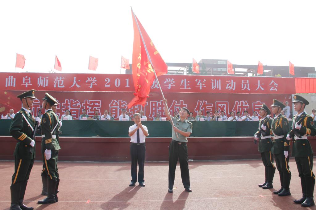 大会在雄壮的国歌声中拉开帷幕。全体人员面向国旗,高唱国歌,庄严肃穆,激情澎湃。会上,副校长王继锁、杨冰分别宣读了军训旅及军训一团、二团组成人员名单。学校党委副书记扈庆学、纪委书记徐思生分别向军训旅授旗,军训旅副政委宋国栋接旅旗并向军训团授旗,军训一团团长杨东、军训二团团长赵秀臣分别接团旗。