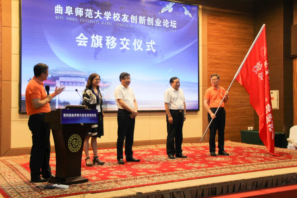 大会举行了会旗交接仪式,副校长、校友理事会执行会长冯冲向第五届校友创新创业论坛的承办单位上海校友会授旗,上海校友会会长鹿传欣在仪式上接过会旗。