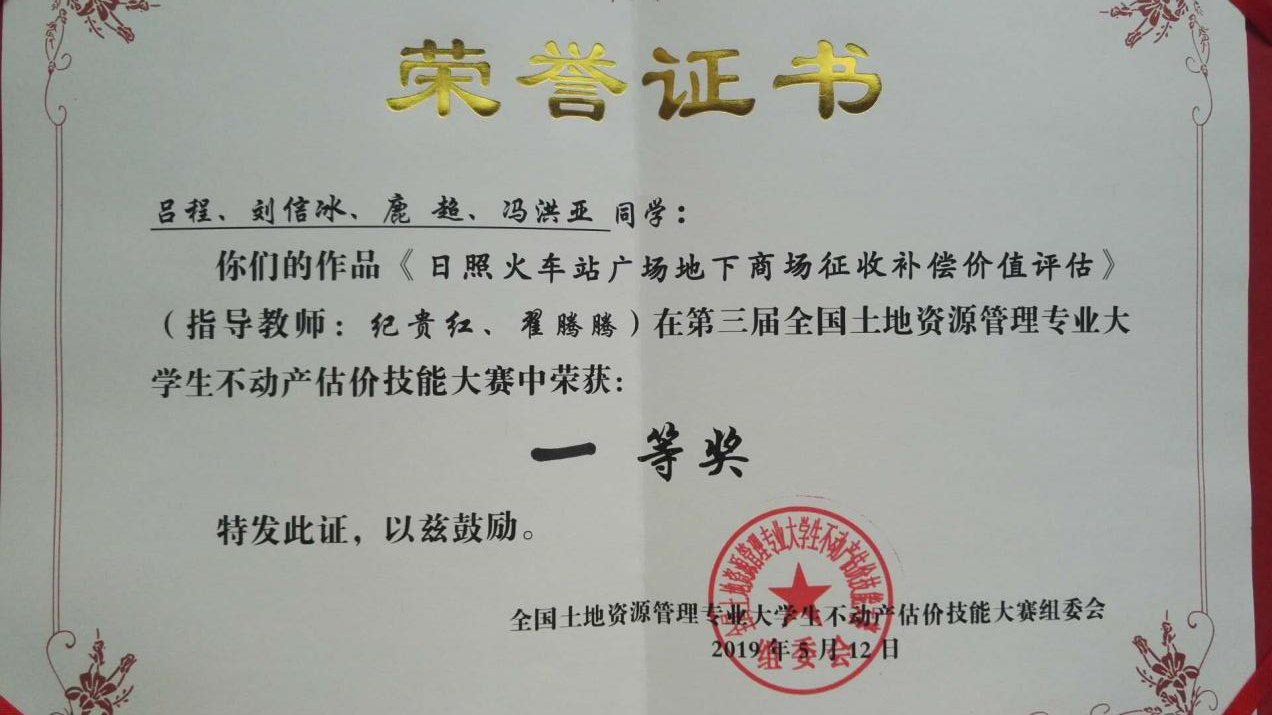 5月11-12日,由教育部高校公管类专业教学指导委员会、全国高校土地资源管理院长(系主任)联席会主办,中国矿业大学环境与测绘学院承办的“博文杯”第三届全国大学生土地资源管理专业不动产估价技能大赛举行。由我校地理与旅游学院教师纪贵红、翟腾腾指导,吕程、刘信冰、鹿超、冯洪亚团队的参赛作品“日照火车站地下商场征收评估报告”荣获大赛一等奖。