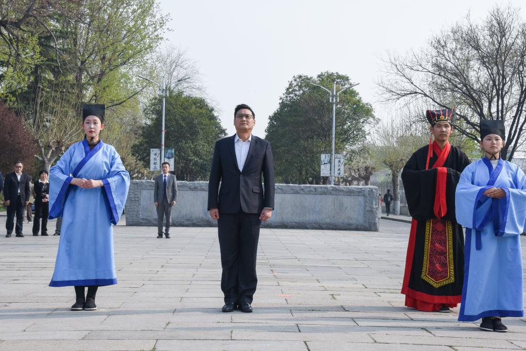 恰逢祭祀祖先、缅怀先人的清明时节,孔垂长先生来到学校后首先在孔子文化广场至圣先师孔子塑像前,与身着汉服、头顶儒冠的我校历史文化学院学子一起,举行了庄严的拜谒仪式。