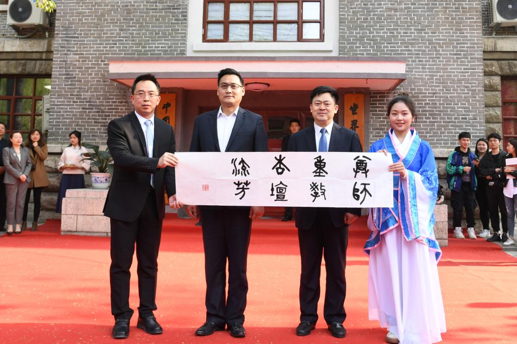 来到中国教师博物馆,戚万学向孔垂长先生赠送了教师博物馆特别定制的尼山石名章,孔垂长先生向博物馆赠送了《万世师表——书画中的孔子》一书。孔垂长、戚万学共同为中国教师博物馆青少年文化教育公益项目“杏坛学堂”揭牌。