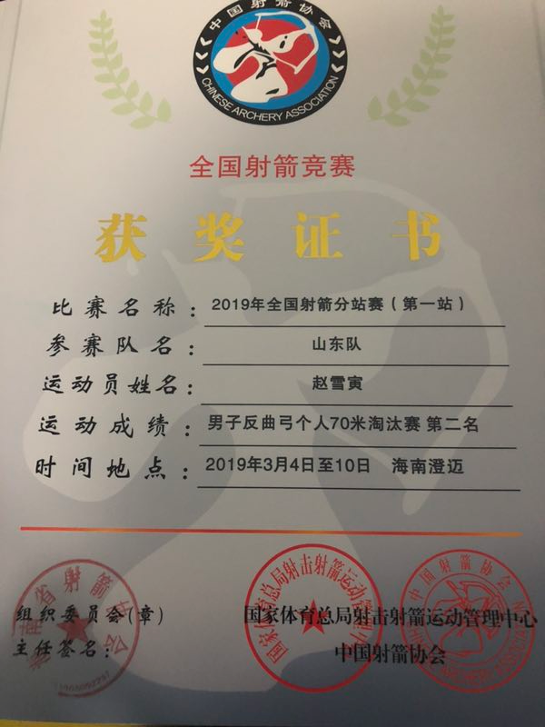 近日,2019年全国射箭分站赛(澄迈站)比赛结束。本次比赛吸引了国内22个省市近300名男女射箭选手参赛。我校体育科学学院2016级学生赵雪寅代表山东队在男子反曲弓个人70米淘汰赛中获得第二名的好成绩。