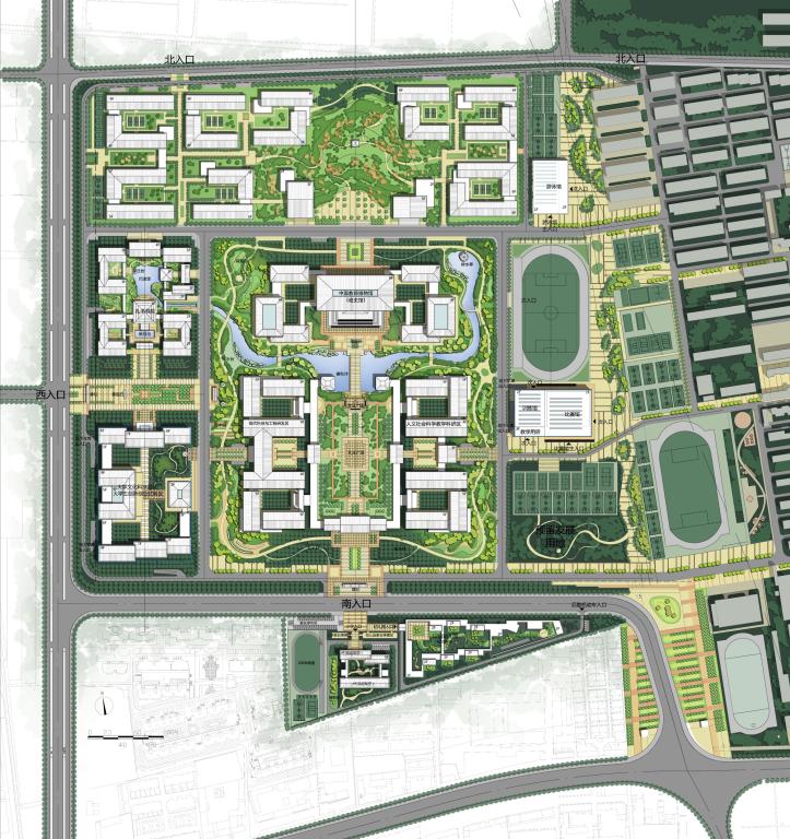 开云手机入口新区在设计中充分汲取孔子思想和儒家文化的精髓,整体立意强调秩序与和谐,通过对空间环境的精巧编排,在校区规划中呈现礼乐教化的儒家思想,使学校成为孔子思想的空间载体和以文化人的环境支撑。新校区建筑风格将以北方明清建筑为范式,力求实现传统建筑形制的当代演绎。规划结构为“一轴、一环、五区”。“一轴”为校园中轴线,串联校门广场、学思书院、杏坛、图书馆建筑群、生活共享区等主要的校园功能。“一环”为生态园林环,对应“学而不厌、诲人不倦”校训,设置学琴师襄、问礼老聃、在齐闻韶、有教无类、因材施教、温故知新六个主题园林。“五区”以教学区为中心,学生生活区、孔子书院、科技园区和体育休闲区环绕周围,形成一主四次的结构。