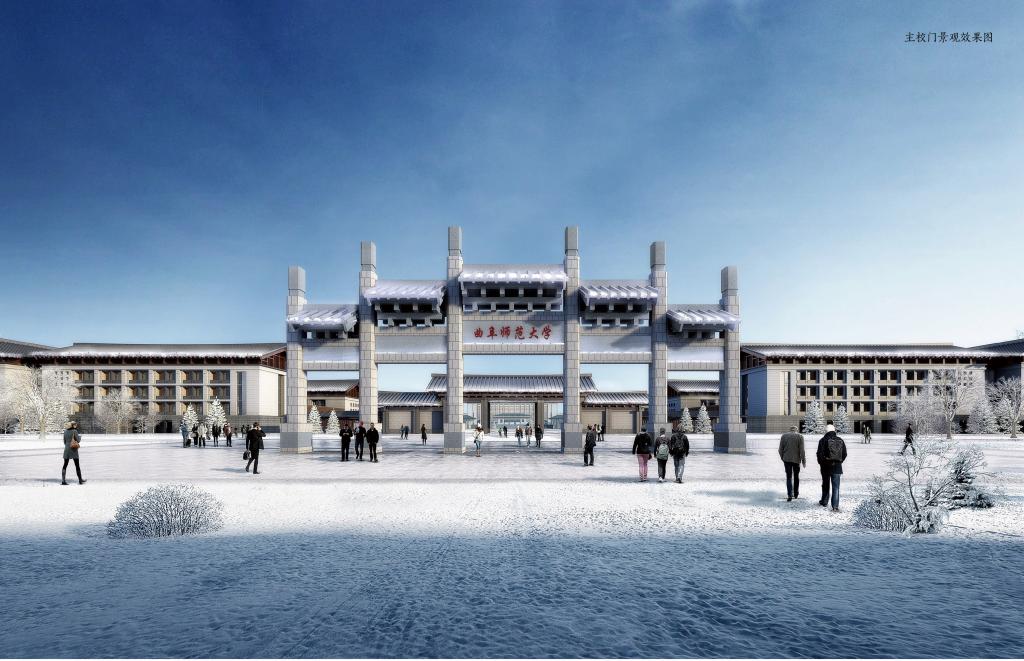 新校区延续曲师大老校区的风格,采用牌坊作为校门。老校区牌坊采用三间三楼不出头,新校区正门牌坊则在造型上借鉴棂星门的冲天样式,规模上借鉴曲阜现存最精美的“万古长春”五开间牌坊,形成五间五楼冲天式形制。新校区西侧门则以“金声玉振”牌坊为原型,设计表现为三间冲天式牌坊样式。
