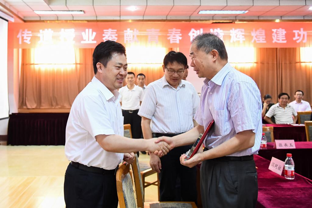 典礼最后,戚万学走到各位荣休老教师身边,亲自为每一位荣休教师颁发了荣誉证书和纪念牌,逐一向各位荣休教师道谢致敬,并和大家亲切握手交流、合影留念。