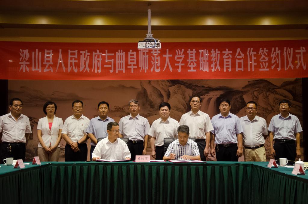 7月28日上午,我校与梁山县人民政府基础教育合作签约仪式在梁山县举行,根据此次签署的合作协议,校地双方将共建开云手机入口附属梁山中学。我校党委书记戚万学,副校长扈庆学,副校长夏云杰,梁山县委书记贾治阜,县委副书记、县长侯典峰,县委常委、县委办公室主任李士兵,县委常委、县委组织部部长王建,出席签约仪式。我校服务地方与对外合作办公室、梁山县教体局负责人参加仪式。签约仪式由梁山县副县长孙颖主持。