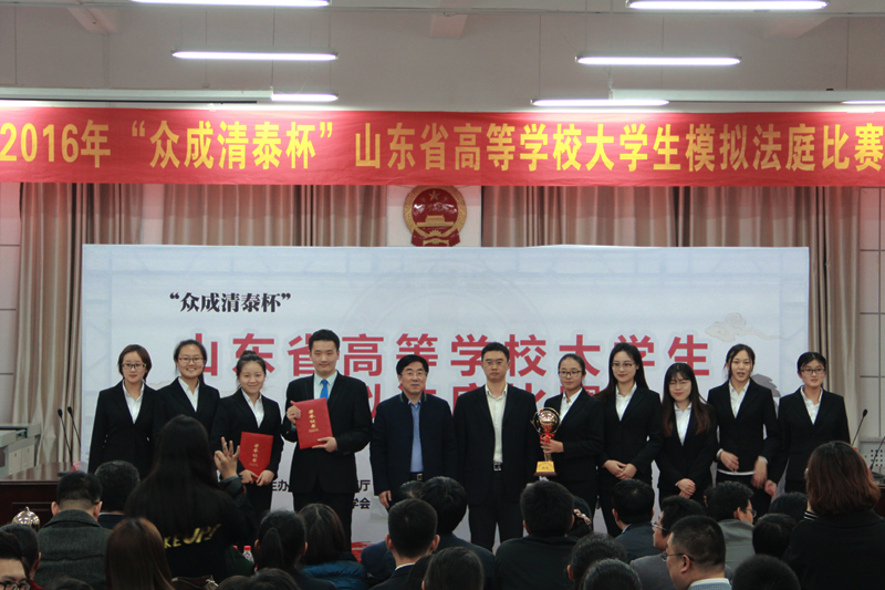 11月6日下午,随着比赛决赛暨颁奖典礼的顺利举行,为期两天的2016年“众成清泰杯”山东省高等学校大学生模拟法庭比赛在我校圆满落幕。此次赛事由山东省教育厅、山东省法学会主办,山东省法学会法学教育研究会和我校法学院承办,众成清泰律师事务所和山东周智律师事务所协办。来自山东省34所高等院校的师生代表和参赛选手共400余人参与了此次比赛活动。经过两天的激烈角逐,我校法学院代表队表现出色,五战全胜,荣获本次大赛最高奖“特等奖”,摘得桂冠。