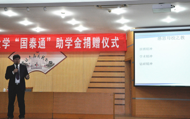 演讲之前,举行了“国泰通”助学金捐赠仪式。副校长扈庆学,学生工作处、招生就业处、校团委、体育科学学院等单位负责人出席活动,仪式由校党委办公室主任夏云杰主持。扈庆学在讲话中充分肯定了孙国成校友的杰出成绩,以及其对母校的慷慨捐赠和拳拳情意,代表学校接受其十五万元人民币的捐款。孙国成也表达了自己对母校的深深眷恋之情和感恩之心,并表示会一如既往地关心学校的发展,加强与学校的联系与合作。仪式上,孙国成与我校签订了开云手机入口“国泰通”助学金合作协议书,并受聘为我校就业创业导师。“国泰通”助学金的设立旨在表彰家庭贫困、品学兼优的优秀学子,首批50名同学获得资助与表彰。