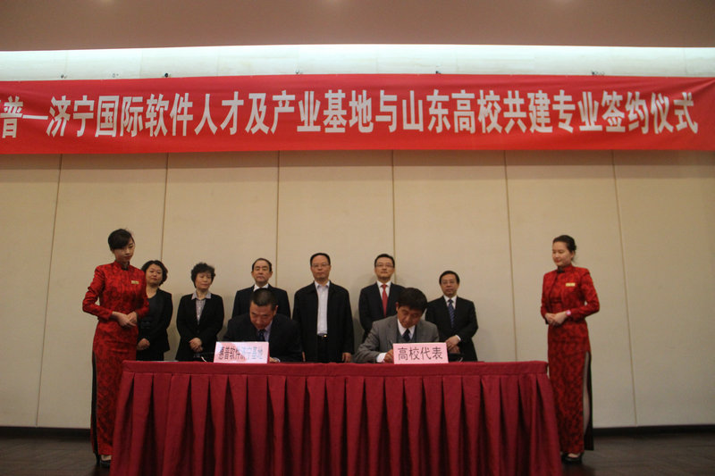 4月28日,常务副省长孙伟、惠普软件大中华区总经理于志伟、省发改委、省教育厅、省经信委、省科技厅、省财政厅、省人社厅、省商务厅、省物价局、济宁市委、市政府主要领导及有关部门负责人和来自全省15所惠普合作高校齐聚山东大厦贵宾厅,举行高校校企合作座谈会暨惠普公司与山东高校共建专业签约仪式。我校副校长王继锁在座谈会发言并代表15所合作高校与惠普公司签署了《惠普(济宁)国际软件人才及产业基地院校合作协议书》。惠普公司将为我校投入建设资金2000余万元,双方共建软件测试技术、软件开发技术、云与大数据专业方向,共建专业实验室和协同创新中心,在科研项目支持、产业融合课程开发、学生实习与就业等方面进行深度合作。