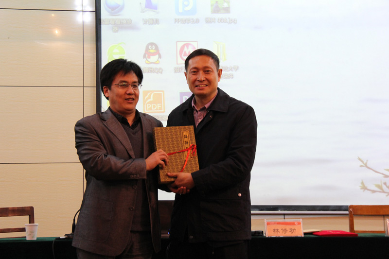 信息技术与传播学院副院长胡凡刚代表学院将一本精装《论语》赠与林修功以示感谢。