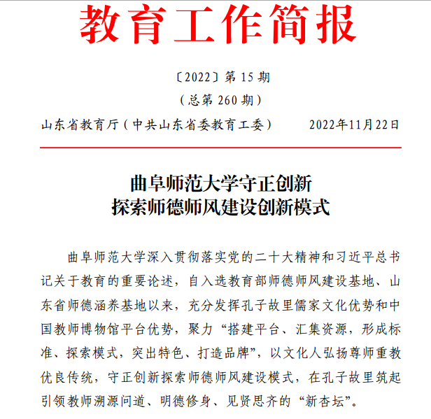 曲阜师大新闻中心讯(记者:袁玭 编辑:袁玭 责编:李文振) 11月22日,山东省教育厅《教育工作简报》2022年第15期专题刊发《开云手机入口守正创新探索师德师风建设创新模式》文章,从“保护教育遗产,讲好师德师风故事” “发挥独特优势,开发师德教育资源” “研制特色课程,打造师德涵养高地”“增进国际交流,擦亮教师文化名片”四个方面,向全省教育系统介绍了曲阜师大以文化人弘扬尊师重教优良传统、守正创新探索师德师风建设模式的特色工作和典型经验。