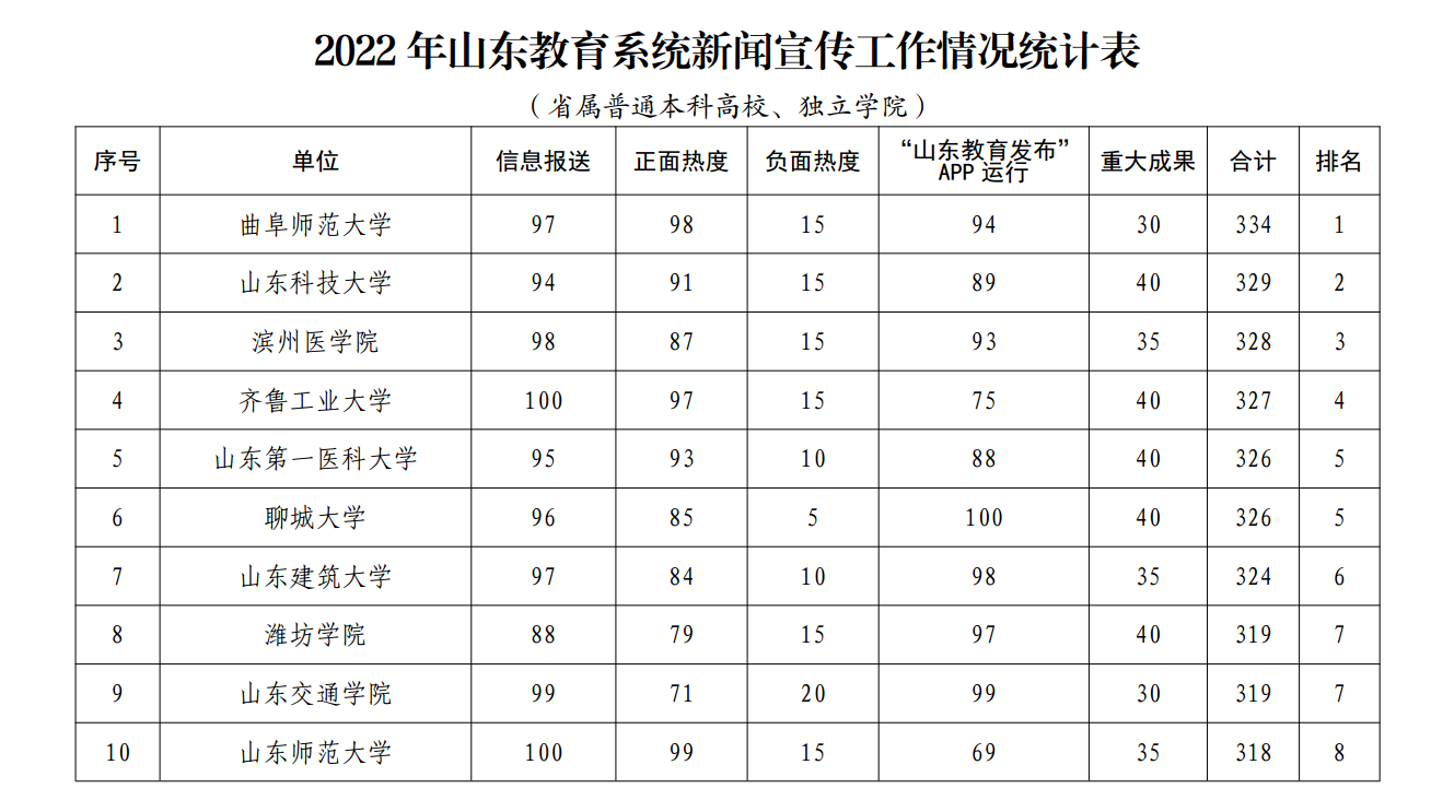 根据《山东省教育厅关于进一步做好新闻宣传通报工作的通知》要求,本次通报对“新闻宣传工作通报指标体系”中信息报送采用情况、正面舆情热度、负面舆情热度、“山东教育发布”APP运行情况、重大宣传成果等五大类指标进行量化赋分和审核认定赋分,评出各单位综合分数及排名情况。