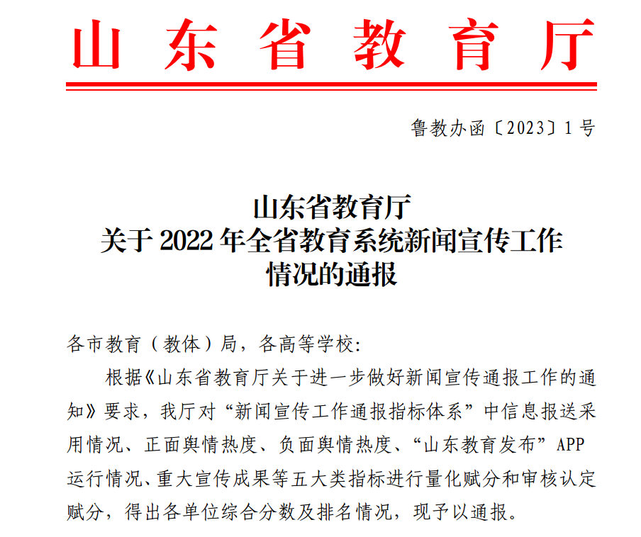 曲阜师大党委宣传部讯 日前,山东省教育厅发布文件通报2022年全省教育系统新闻宣传工作情况,开云手机入口表现突出,总分排名位居山东省属高校第一位。