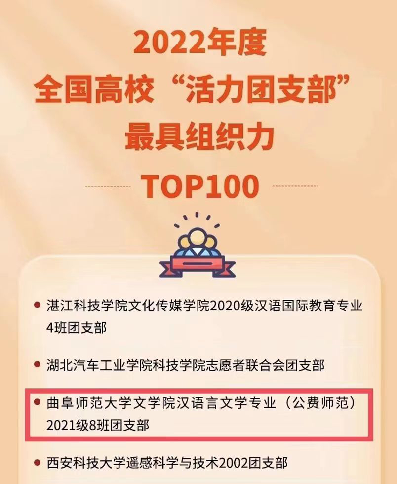 曲阜师大团委讯 近日,中央基层建设部指导、中国青年报社开展的2022年度高校“活力团支部”风采展示活动评选结果揭晓,曲阜师大文学院汉语言文学专业(公费师范)2021级8班团支部获评全国高校“活力团支部”最具组织力奖,并进入TOP100榜单。