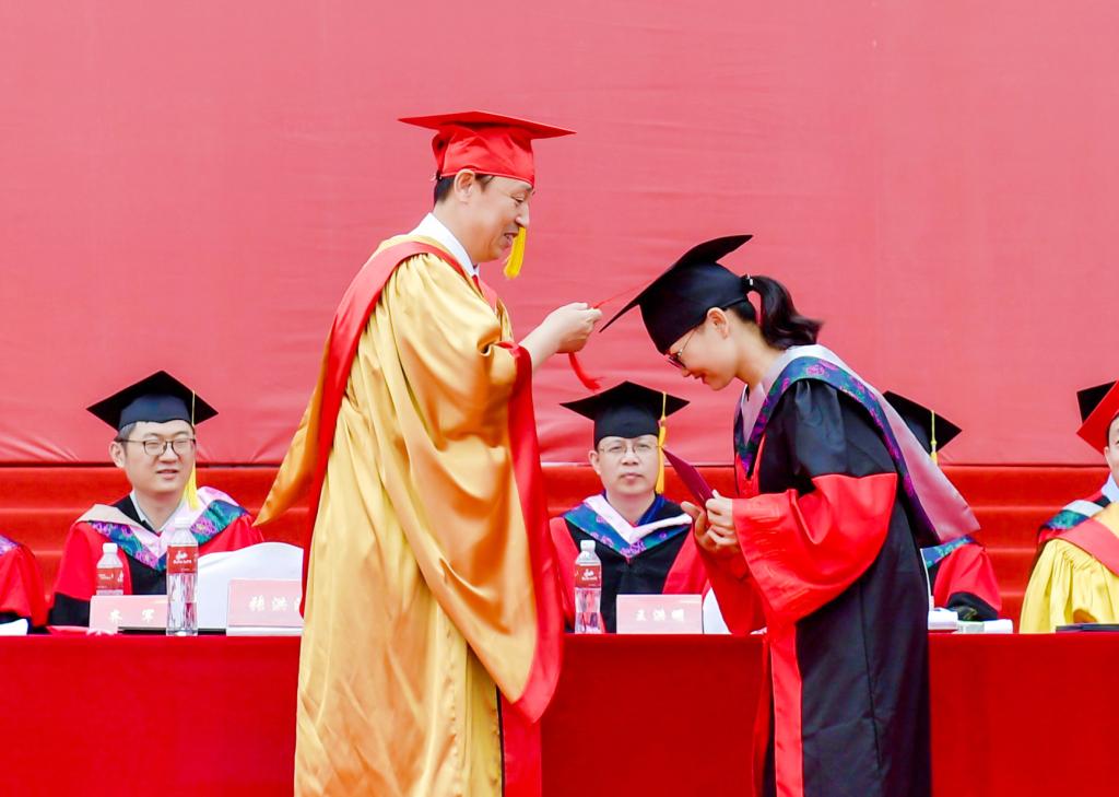 党委副书记、校长张洪海为获得博士学位的同学拨穗正冠、颁发学位证书