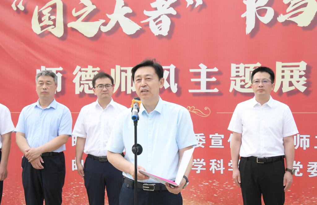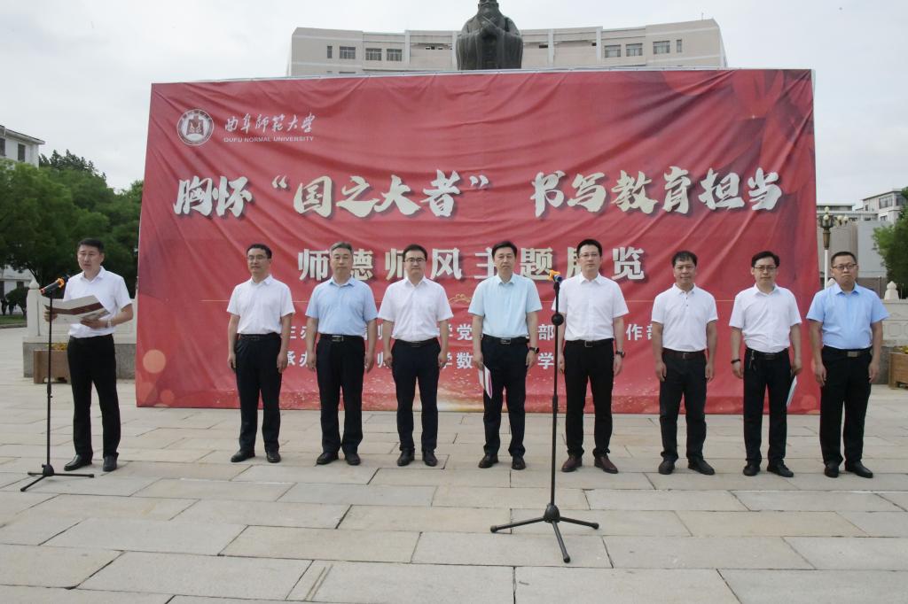 曲阜师大数学科学学院讯 为深入学习贯彻习近平总书记关于加强师德师风建设的重要论述,落实立德树人根本任务,营造涵养师德、争做“四有”好老师的良好氛围,6月18日下午,曲阜师大举办“胸怀‘国之大者’,书写教育担当”师德师风主题展。本次活动由学校党委宣传部、教师工作部主办,数学科学学院党委承办。学校党委副书记、校长张洪海,党委常委、宣传部部长孙祥广出席展览开幕式。数学科学学院即将走向教师岗位的全体毕业学子以及部分教师代表参加了开幕式。开幕式由数学科学学院党委书记宋国栋主持。