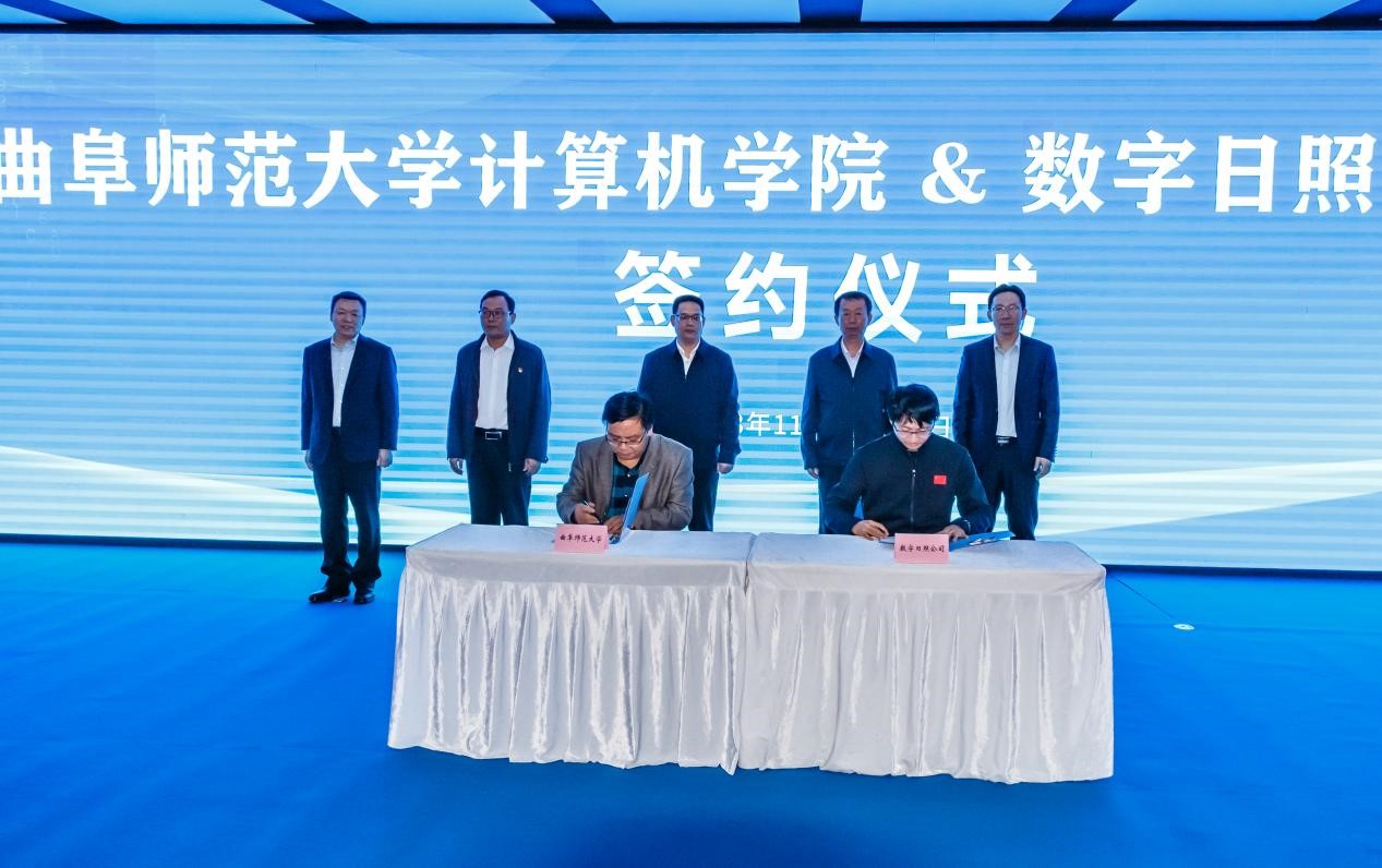计算机学院院长李光顺与数字日照有限公司副经理王亮共同签署实践基地合作协议。计算机学院副院长尚军亮、副教授刘智斌分别与数字日照有限公司副经理孙渊共同签署项目合作协议。