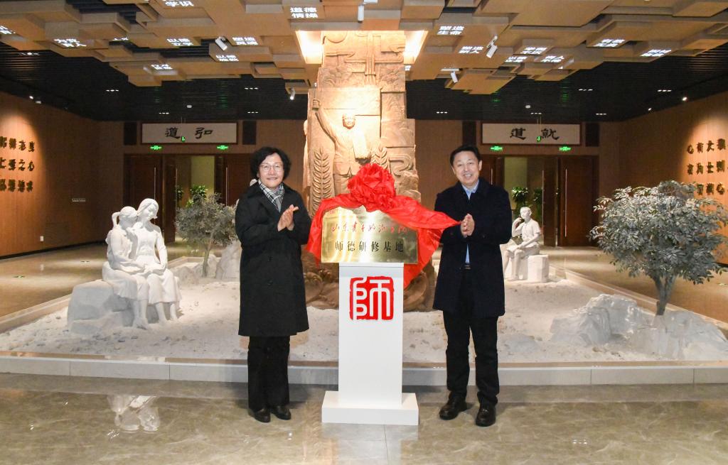 座谈结束后,魏艳菊、辛杰一行参观了教师博物馆、学校实训中心。魏艳菊、张洪海共同为山东青年政治学院师德研修基地揭牌。