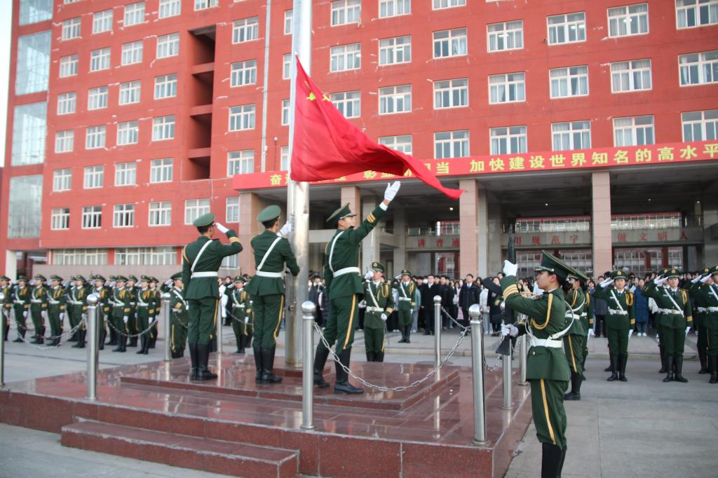 东方欲晓,师生齐聚升旗点,肃穆而立,庄严而隆重地庆祝新年第一天的到来。国旗护卫队迈着铿锵有力的步伐,昂首阔步护卫国旗走向升旗台。在雄壮的国歌声中,鲜艳的五星红旗冉冉升起,伴着清晨的屡屡阳光迎风飘扬。在场师生向国旗行注目礼,对伟大祖国致以崇高的敬意和美好的祝福。