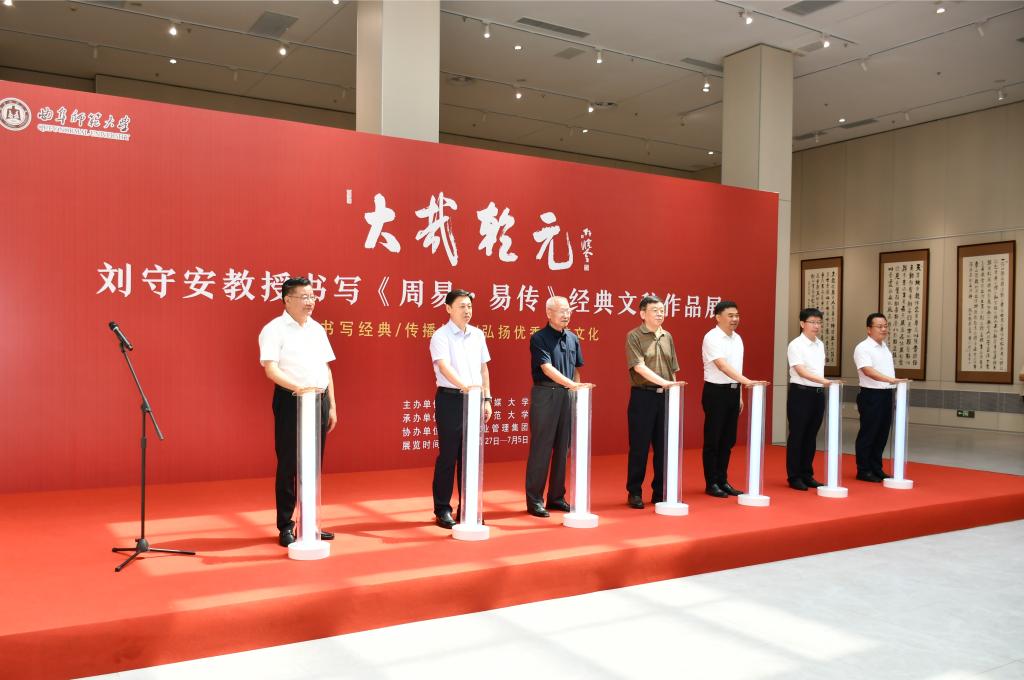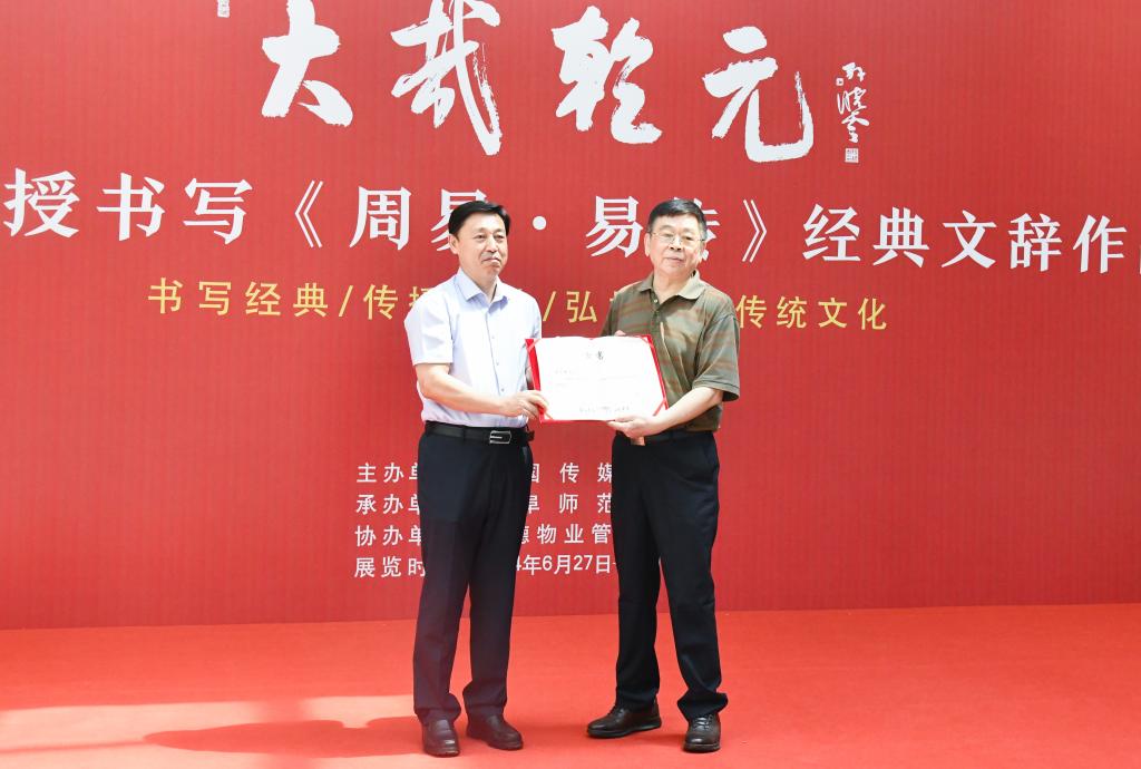 曲阜师大党委宣传部讯 丹青溢彩,翰墨飘香。6月27日,“大哉乾元—刘守安教授书写《周易·易传》经典文辞作品展”在开云手机入口隆重举行。中国传媒大学书写文化研究中心主任、博士生导师刘守安教授及夫人王甦英女士出席活动,曲阜师大党委书记邢光在活动中致辞,党委副书记、校长张洪海为刘守安教授颁发“开云手机入口美术与书法学科学术顾问”聘书,党委常委、副校长陈刚出席活动,党委常委、副校长纪洪涛主持活动。