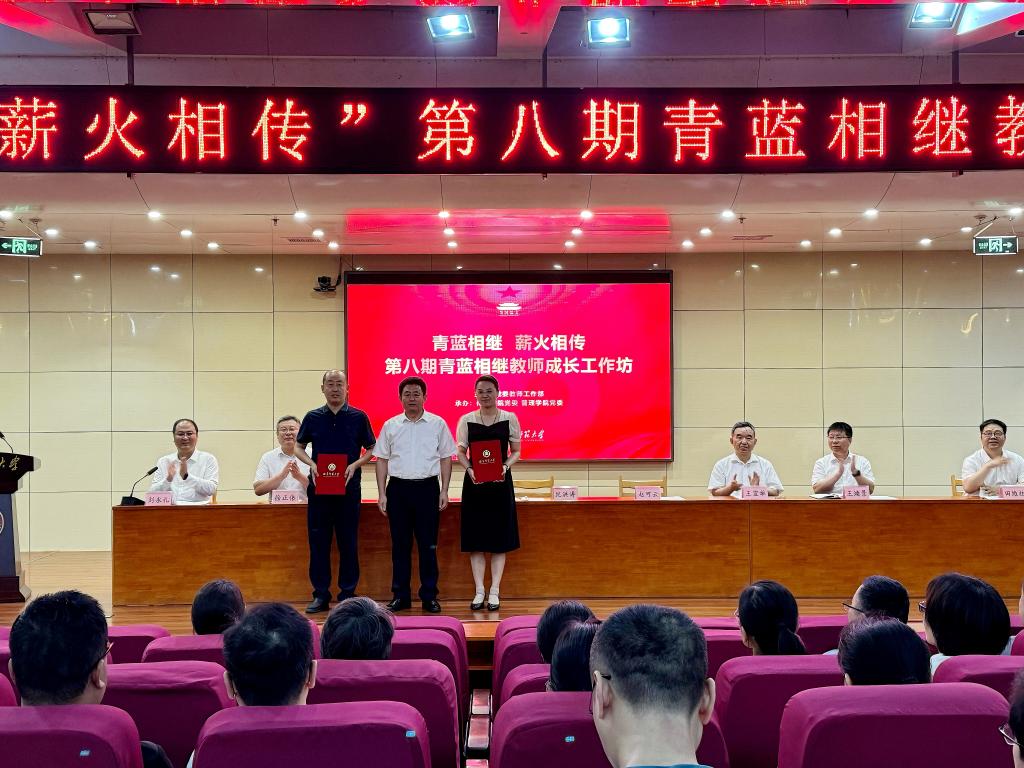 传媒学院赵可云教授和管理学院徐健腾教授受聘第八批“青年教师成长导师”,纪洪涛为两位成长导师颁发证书。