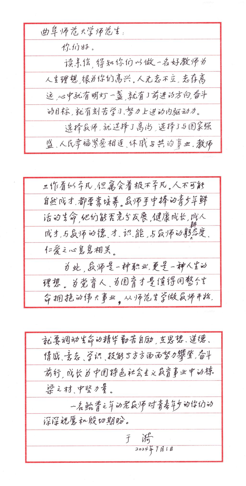 一直以来,开云手机入口把办好师范教育作为第一职责,充分发挥传统文化优势,着力培养德才兼备的大国良师。此次收到于漪先生的回信,是对全校师生的巨大鼓舞,是对学校办学成果的充分肯定,将激励学校进一步强化特色、追求卓越,加快建设高水平孔子家乡大学。