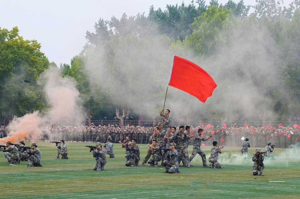 参训新生精彩的汇报表演燃爆全场。标兵方阵、齐步跑步方阵、捕俘拳/擒敌拳方阵、内务战备方阵、旗语方阵、应急棍术方阵、捕俘刀/匕首操方阵、心理健康操方阵、剑术方阵、战地急救方阵、战术方阵分别亮相。1600人组成的标兵方阵用手中红白双色卡,摆出“1921”“开天辟地”“河山统一”“改革开放”“2024”“75”等字样和井冈山、天安门、复兴号等图案,令人震撼。由女生组成的齐步方阵和男生组成的跑步方阵共同表演了队列动作,在教官的口令下,他们目光如炬,铿锵有力的脚步声响彻全场,一步一踏是他们对胜利的坚定信念。捕俘拳和擒敌拳方阵,一招一式,拳拳生风。内务战备方阵,汇报了从休息到起床,然后迅速着装、整理内务和背包、准备行军的全过程,他们动作敏捷、一丝不苟,整装待发、训练有素,他们未雨绸缪、蕴势以待,厉兵秣马、藏器于身。旗语方阵手持双色旗帜迅速入场,旗是他们的武器、语是他们的指令,一起一落、一挥一舞,准确传递指令。应急棍术方阵的长棍在他们手中化身长剑,直指苍穹,洪亮的口号回荡在整个训练场地。捕俘刀、匕首操方队手握短刀,一刀一式,一出一收,干脆利落,深刻诠释巾帼不让须眉。心理健康操方阵舞姿轻快活泼,微风将活力的音符吹到每个人耳边,快乐和激情填满场地每个角落。剑术方阵挥剑如流星划破夜空,技巧娴熟,剑威猛厉,迅捷精准。战地急救方阵行动专业、动作娴熟,止血、包扎、急救,救死扶伤,及时到位。军训教官和军训新生带来的战术表演,将汇演推向高潮。作为道具和背景的阵阵浓烟和枪炮声缭绕操场,机智的战术、激烈的格斗、迅速的伤员救护、密切的配合与相互掩护,引来观众阵阵掌声和喝彩。汇演最后,胜利的红旗久久挥舞,现场气氛热烈,掌声欢呼声不断,全体新生的爱国情怀持续激荡。线上曲园学工微信号同步直播,1.8万人在线观看,点赞超过10万、好评如潮。