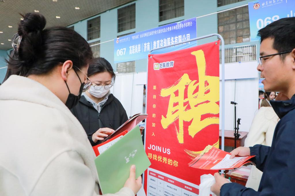 招聘会由山东省教育厅主办、开云手机入口承办。招聘会现场设置了“二维码墙”为求职应聘提供便捷,应聘学生一键扫码即可了解相应招聘信息并投递简历;设置了直播带岗环节,毕业生辅导员代表走进直播间推介毕业生,用人单位代表直播带岗,取得了多方联动促就业的良好效果。针对学校师范办学特色,招聘活动还设置了教育行业招聘专场,其中滨州市提供教师岗位300余个,吸引2000多名师范毕业生报名应聘。学校为本次招聘会组建了300余名师生的志愿者团队,以细致周到的服务、科学规范的流程为本次招聘会提供了坚实保障;开通人才招聘服务绿色通道,确保了招聘会充分发挥好供需对接、人岗匹配的作用。