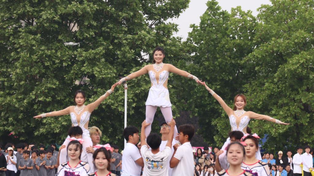开幕式上,体育学部中国舞艺术团的舞者们化身灵动仙子,以一支古典舞《浮光》,勾勒水墨雅韵;花球与技巧啦啦操燃动全场,尽展活力与勇气。法学院团体操《奔跑的青春》中,折扇、鼓点、狮影交织,传统与现代碰撞,以青春热忱向校庆致敬。地理与旅游学院270名学子以团体操献礼:《哪吒》舞敢闯精神,《Get Up》展逐梦向往,《美丽中国梦》显使命担当,“曲师70”字样致敬七秩风华。最后,各学院学子组成的广播操方阵步伐矫健,以明快节奏展现曲园学子积极向上的精神风貌。各学院方阵次第登场,曲园学子统一着装、步伐铿锵、口号嘹亮,以自信昂扬之姿展现青春风采,既彰显“犁牛之子”精神底色,更传递续写时代华章的坚定信念。传统底蕴与现代创意交相辉映,激荡起运动盛会的澎湃青春动能。
