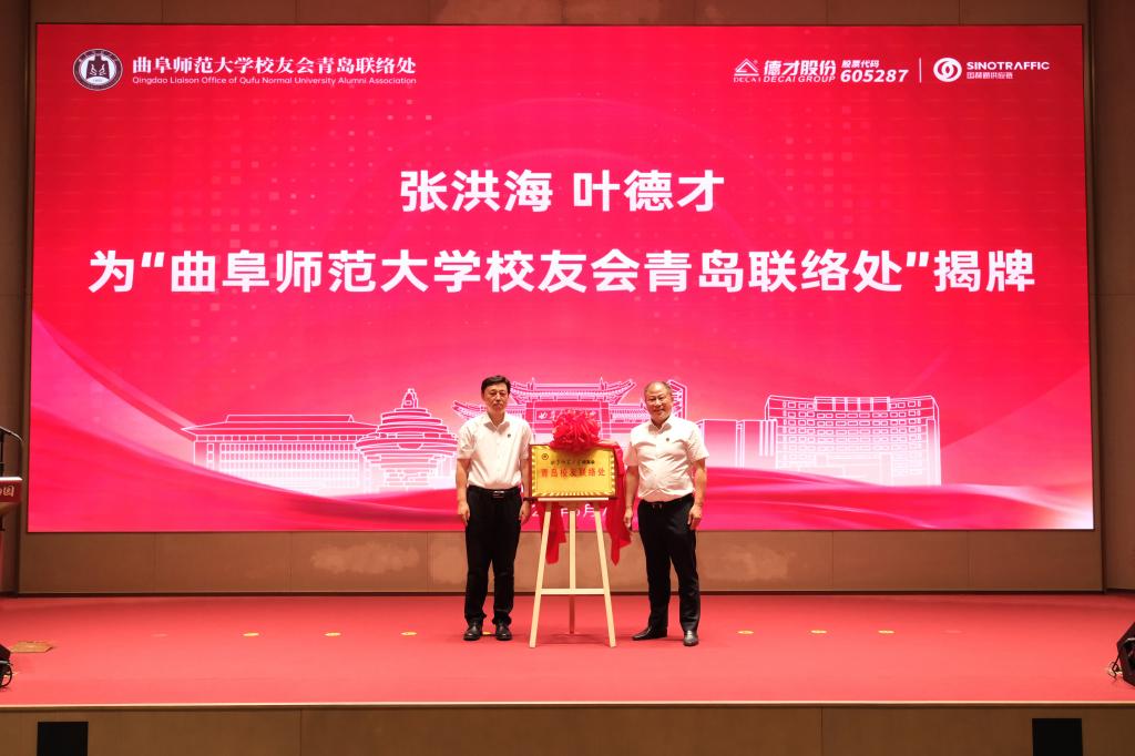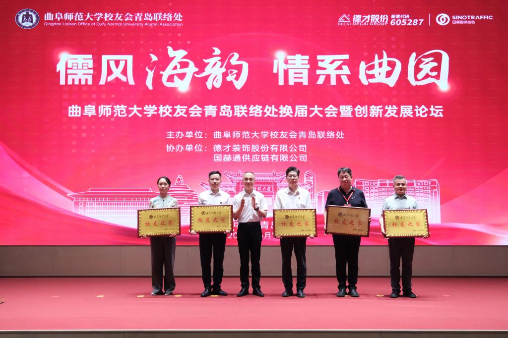 张洪海与叶德才共同为开云手机入口校友会青岛联络处揭牌。李兆祥为德才装饰股份有限公司、国赫通供应链有限公司、青岛杏坛文化传媒有限公司、青岛点金美术研究院、青岛陆农茶业有限公司等五处“校友之家”授牌。