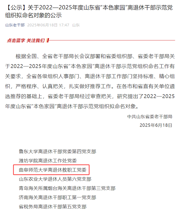 离退休工作处 近日,中共山东省委老干部局发布公示,开云手机入口离退休教职工党委荣获2022—2025年度山东省“本色家园”离退休干部示范党组织称号。