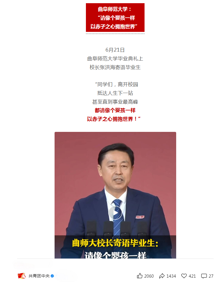 “掏心话”暖,“提气话”燃,娓娓道来又语重心长的毕业寄语,为起航再出发的毕业学子们传递了致青春、向未来、永奋进的满满能量,在毕业典礼当天登上抖音山东16市热榜,闪电新闻、百度、哔哩哔哩等平台直播总量达到“200万+”。