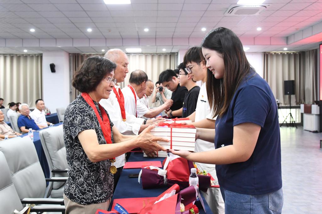 仪式最后,老党员们带着期许与关爱,为学生党员佩戴党员徽章,一枚枚党徽佩戴在青年党员胸前,闪耀着信仰的光芒;他们还将《曲园往事》赠予学生党员,这本书承载着学校的历史与精神,传递着党的精神与学校的历史传承,象征着红色基因的代代相传,激励着青年党员在新时代的征程中奋勇前行。