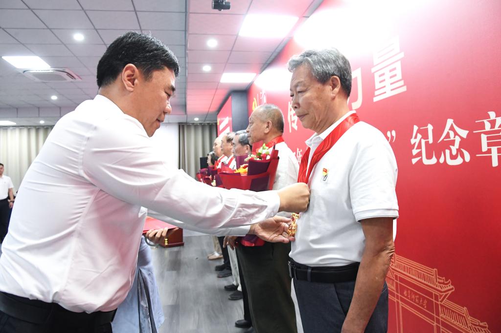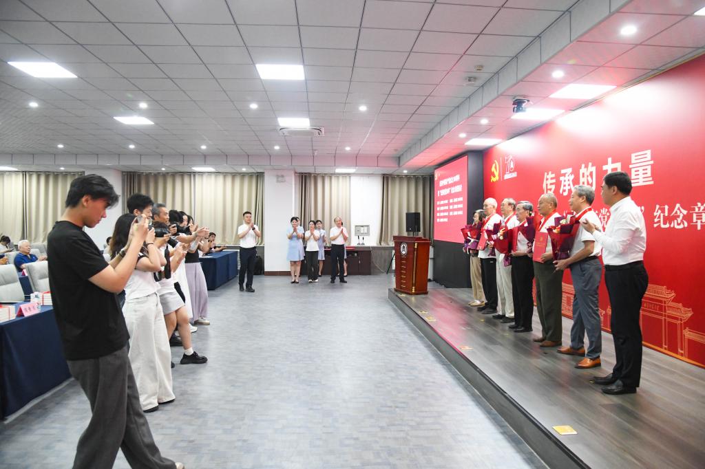 学校党委书记邢光为老党员代表颁发并佩戴“光荣在党50年”纪念章