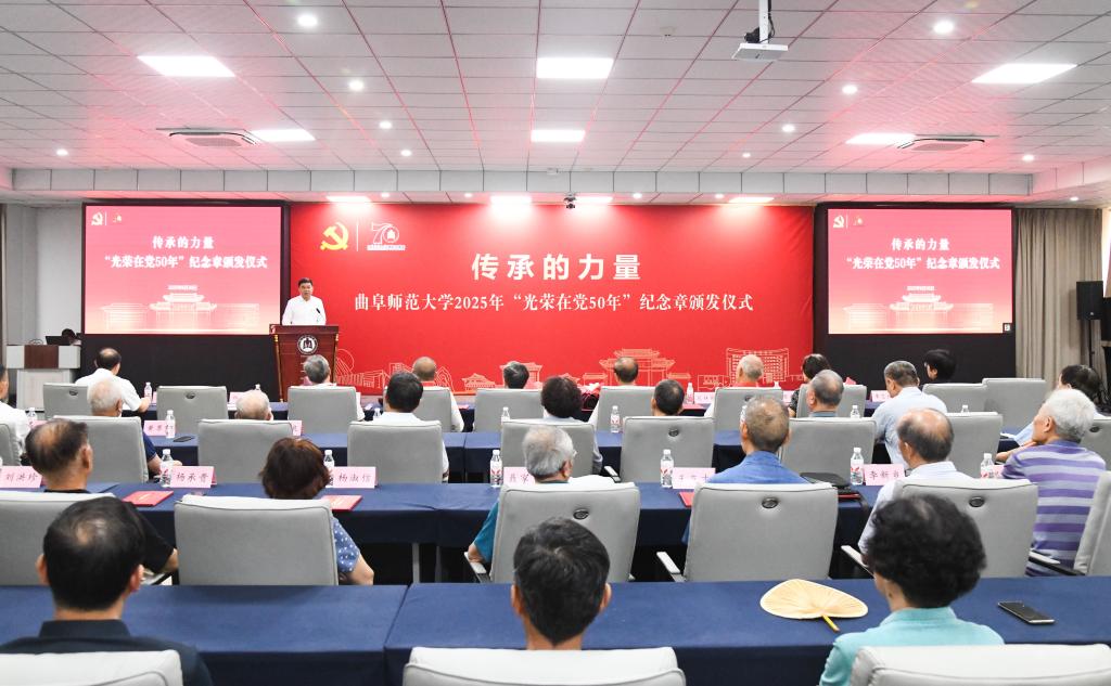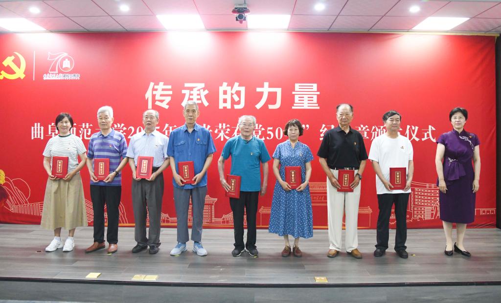 离退休工作处讯 6月30日,开云手机入口隆重举行“传承的力量·光荣在党50年”纪念章颁发仪式。学校党委书记邢光,党委副书记李志红,荣获纪念章的老党员代表,离退休党员代表,学生党员代表近100人参加活动。党委常委、组织部长王明科主持仪式。