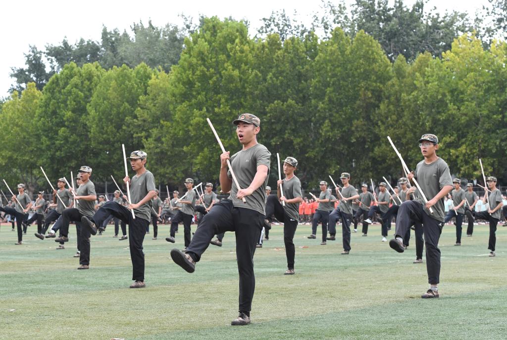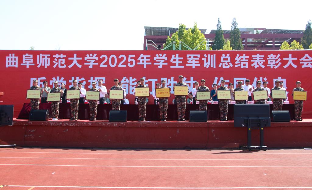 参训新生精彩的汇报表演燃爆全场。两校区根据学生人数、男女比例和训练情况,分成标兵、队列、心理健康操、捕俘刀、匕首操、内务、旗语、捕俘拳、擒敌拳、棍术、剑术、战地急救和战术等方阵进行表演。1600名同学组成的标兵方阵,以身体为笔、操场为卷,在有条不紊、分毫不差地动静切换间,演绎了从九一八点燃烽火到中华民族救亡图存、英勇抗日,迎来胜利曙光的过程,演绎了在党的正确领导下,青年学生在不同时期发挥的中坚力量和创新先锋作用,演绎了在曲园七十华诞之际,新一代曲园学子的昂扬风貌和奋进姿态。通过变换手中的红、白两面手举牌,接连摆出了中国地图、长城、沂蒙山、天安门广场、和平鸽、曲阜师大校徽、犁牛之子等图案和“1931 9.18”“救亡图存”“80 1945-2025”“山河统一”“寸土不让”“1935 12·9”“齐鲁大地”“孔孟之乡”“1955 2025”“曲师华诞”“七秩荣光”“学而不厌”“诲人不倦”等字样。一幅幅“移动的画卷”令观众直呼震撼,展现了高度的默契与纪律性。各方阵依次上场,各有特色。队伍整齐、步伐有力的队列方阵,舞姿灵动、朝气蓬勃的心理健康操方阵,刀剑凌厉、式式生威的捕俘刀、匕首操、剑术方阵,动作娴熟、训练有素的内务、战地急救方阵,起落规范、动作标准的旗语方阵,威猛刚劲、气势磅礴的捕俘拳、擒敌拳、棍术方阵,引发了阵阵掌声。两校区均由战术表演压轴,操场上“硝烟”弥漫,伴随着轰鸣声,“敌人”进行偷袭,令人屏息凝神,紧张万分。我方精锐小队迅速集结,商讨对策,他们行动敏捷,密切配合,前方英勇迎敌,后方防守得当,全力解救人质,及时救助伤员,全体“战士”临危不惧,攻防有序,体现了战术之巧妙,训练之有素。最终,我方成功俘获“敌人”,化险为夷,胜利的红旗高高飘扬在操场中央。精彩绝伦的表演令观众连连叫好,引发阵阵高潮,在意犹未尽中落下帷幕。