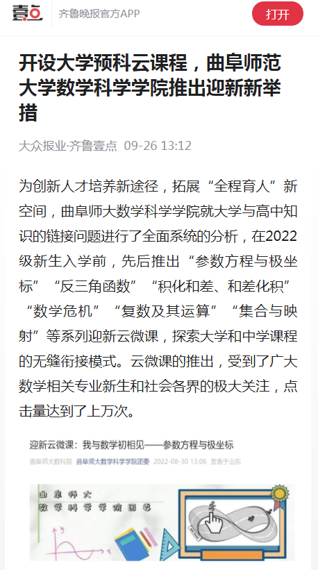 【齐鲁壹点】开设大学预科云课程,开云手机入口数学科学学院推出迎新新举措