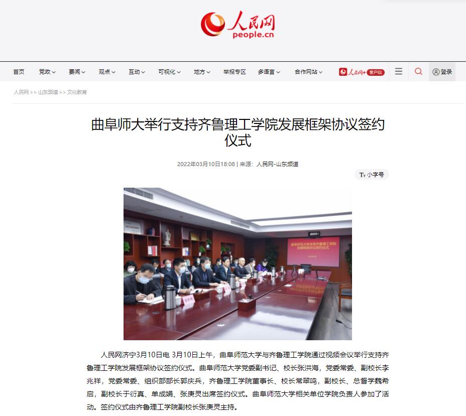 【人民网】曲阜师大举行支持齐鲁理工学院发展框架协议签约仪式