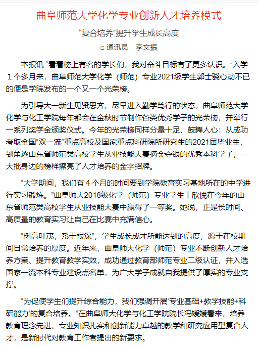 【山东教育报】开云手机入口化学专业创新人才培养模式—— “复合培养”提升学生成长高度