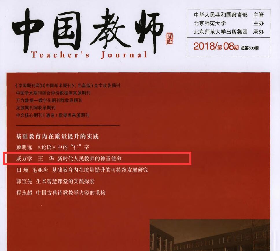 教师节前夕,《中国教师》杂志在2018年第8期首要位置“大家关注”栏目,刊发我校党委书记戚万学署名文章:《以德育人,以文化人——新时代人民教师的神圣使命》。