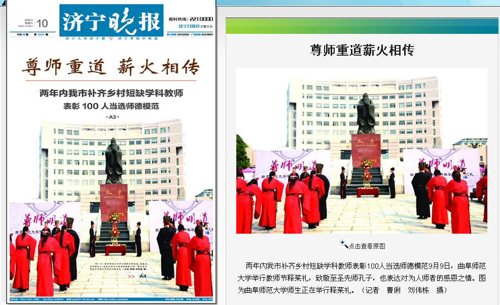 济宁晚报《曲师大尊师重道薪火相传》:http://epaper.jn001.com/jnwb/html/2016-09/10/content_175465.htm
