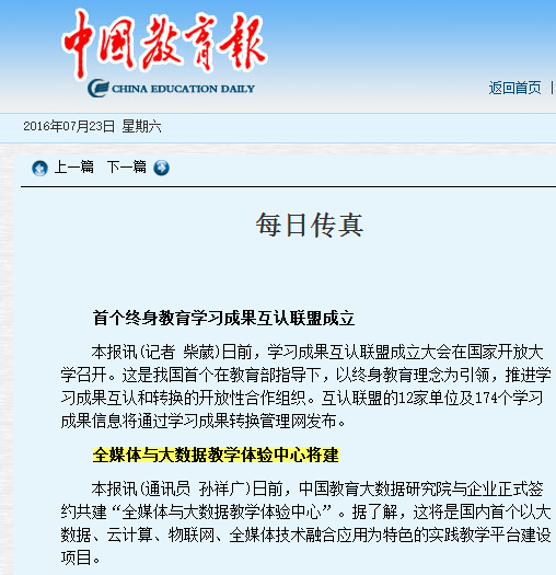 中国教育报:国内首个“全媒体与大数据教学体验中心”将建