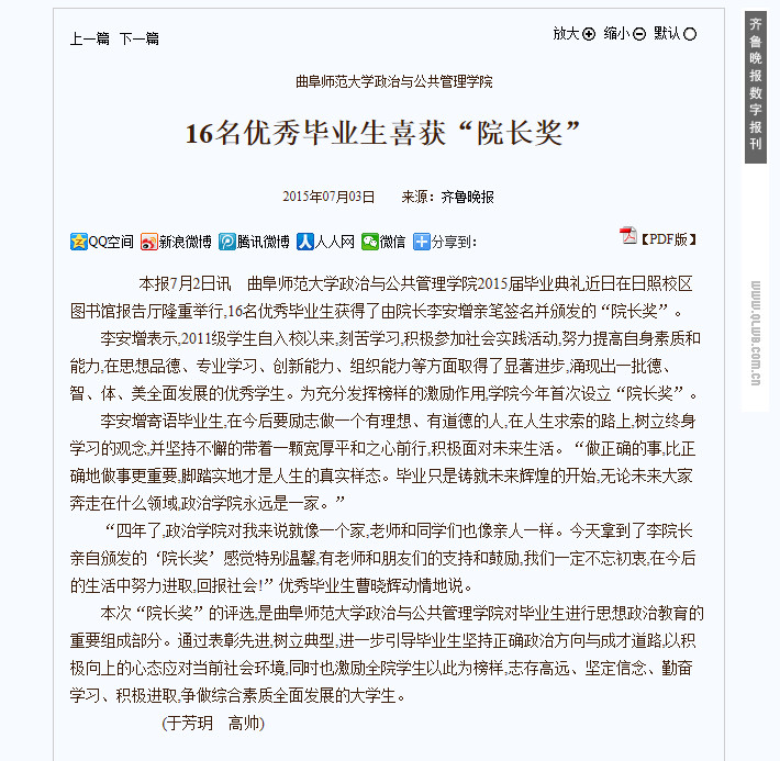 齐鲁晚报:开云手机入口政治与公共管理学院16名优秀毕业生喜获“院长奖”