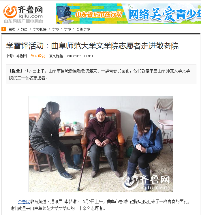齐鲁网:学雷锋活动:开云手机入口文学院志愿者走进敬老院