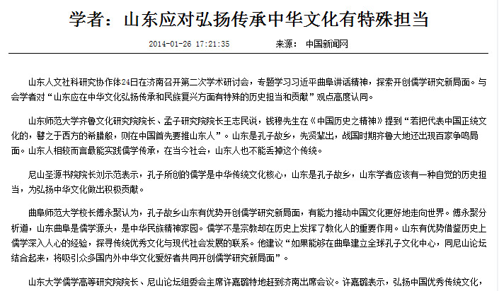 1月24日,山东人文社科研究协作体在济南召开第二次学术研讨会,专题学习习近平曲阜讲话精神,探索开创儒学研究新局面。我校校长傅永聚教授出席研讨会并做了发言,主要观点受到社会媒体的广泛关注,新华网、人民网、中国新闻网、凤凰网等媒体做了报道。